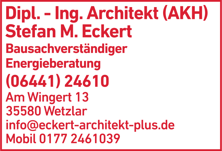 Die Adresse von Eckert Stefan M. Dipl. - Ing. Architekt lautet: Am Wingert 13, 35580 Wetzlar-Nauborn
