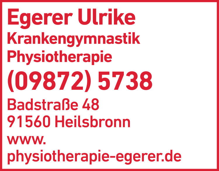 Die Adresse von Egerer Ulrike Physiotherapie lautet: Badstr. 48, 91560 Heilsbronn