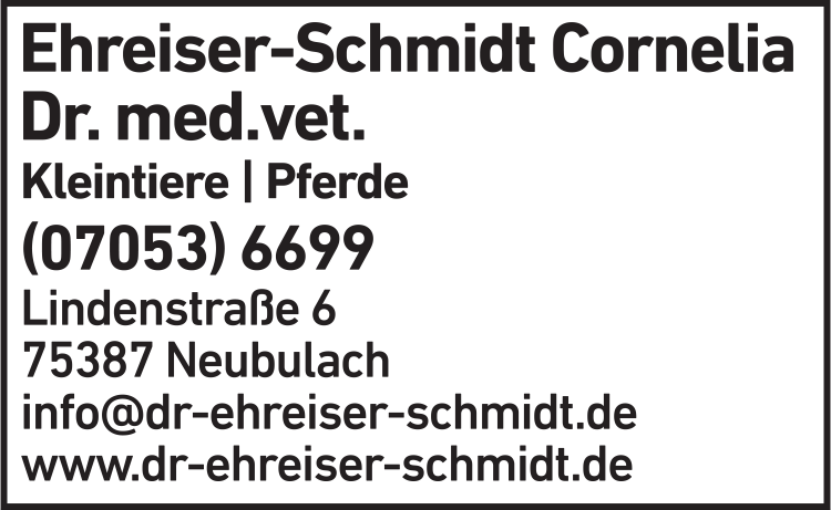 Die Adresse von Ehreiser-Schmidt Cornelia Dr. med. vet. Tierarztpraxis lautet: Lindenstr. 6, 75387 Neubulach