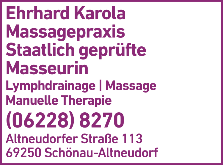 Die Adresse von Ehrhard Karola Massagepraxis lautet: Altneudorfer Str. 113, 69250 Schönau
