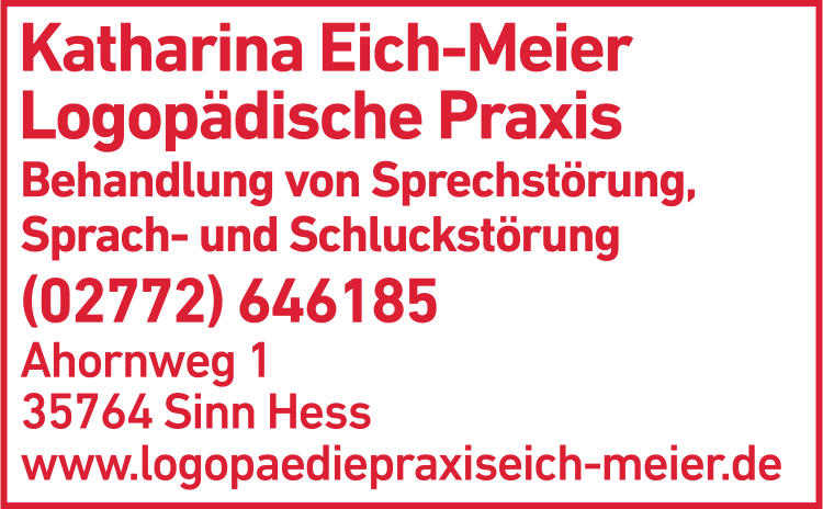 Die Adresse von Eich-Meier Katharina Logopädische Praxis lautet: Ahornweg 1, 35764 Sinn