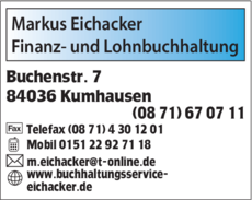 Die Adresse von Eichacker Markus lautet: Buchenstr. 7, 84036 Kumhausen