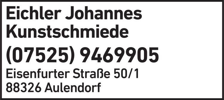 Die Adresse von Eichler Johannes Kunstschmiede lautet: Eisenfurter Str. 50/1, 88326 Aulendorf