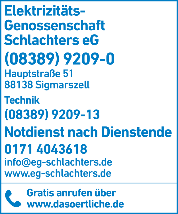 Die Adresse von Elektrizitäts-Genossenschaft Schlachters eG lautet: Hauptstr. 51, 88138 Sigmarszell