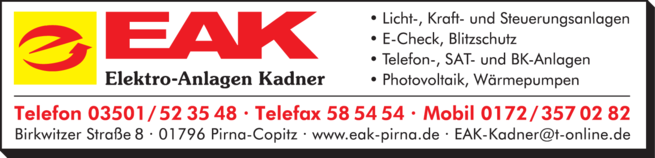 Elektro-Anlagen Kadner in Pirna bietet Ihnen zahlreiche Dienstleistungen in den Bereichen Elektroinstallationen, Wärmepumpen, Telefonanlagen oder Steuerungsanlagen. Informationsbeschaffung im Internet ist ein nützlicher erster Schritt, doch für das ausführliche Besprechen Ihres Projekts ist ein persönlicher Kontakt unabdingbar. Bei Elektro-Anlagen Kadner nimmt man sich viel Zeit für Ihre Fragen und Wünsche. Das Unternehmen ist auch im Sicherheitsbereich aktiv und installiert für Sie Brandmeldeanlagen, Türsprechanlagen, Blitzschutz, Überspannungsschutz oder auch Alarmanlagen. Durch Stromerzeugung mithilfe von Photovoltaik wiederum, nutzen Sie Ihr Hausdach gewissermaßen zum Geldverdienen. Informieren Sie sich diesbezüglich auch gerne über Speicheranlagen, mit denen Sie den erzeugten Strom nach Ihrem Bedarf nutzen können. |