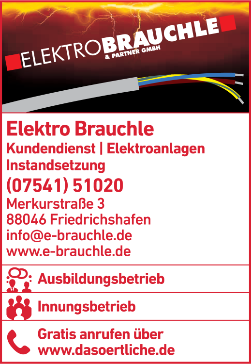 Die Adresse von Elektro Brauchle & Partner GmbH lautet: Merkurstr. 3, 88046 Friedrichshafen
