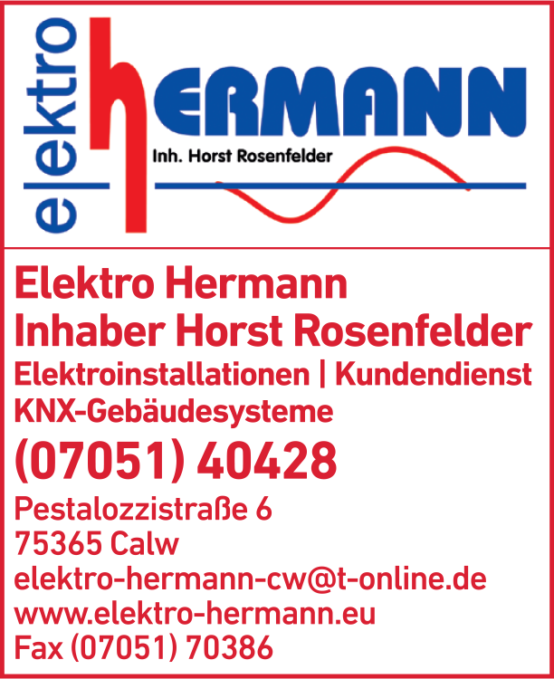 Die Adresse von Elektro Hermann lautet: Pestalozzistr. 6, 75365 Calw-Wimberg