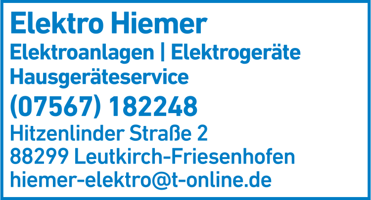Die Adresse von Elektro Hiemer Elektroinstallation & Hausgeräteservice lautet: Hitzenlinder Str. 2, 88299 Leutkirch