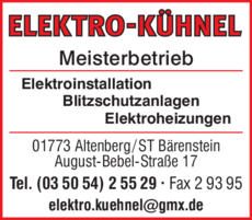 Die Adresse von Elektro-Kühnel lautet: August-Bebel-Str. 17, 01773 Altenberg