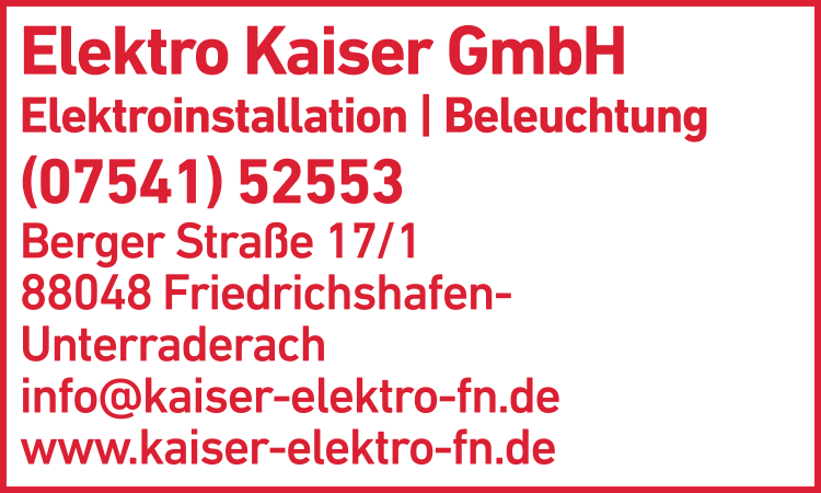Die Adresse von Elektro Kaiser GmbH lautet: Berger Str. 17/1, 88048 Friedrichshafen