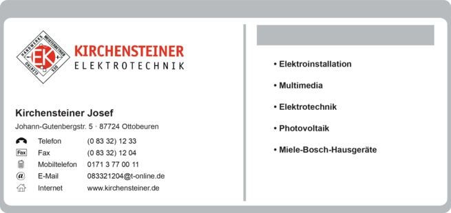 Die Adresse von Elektro Kirchensteiner lautet: Johannes-Gutenberg-Str. 5, 87724 Ottobeuren