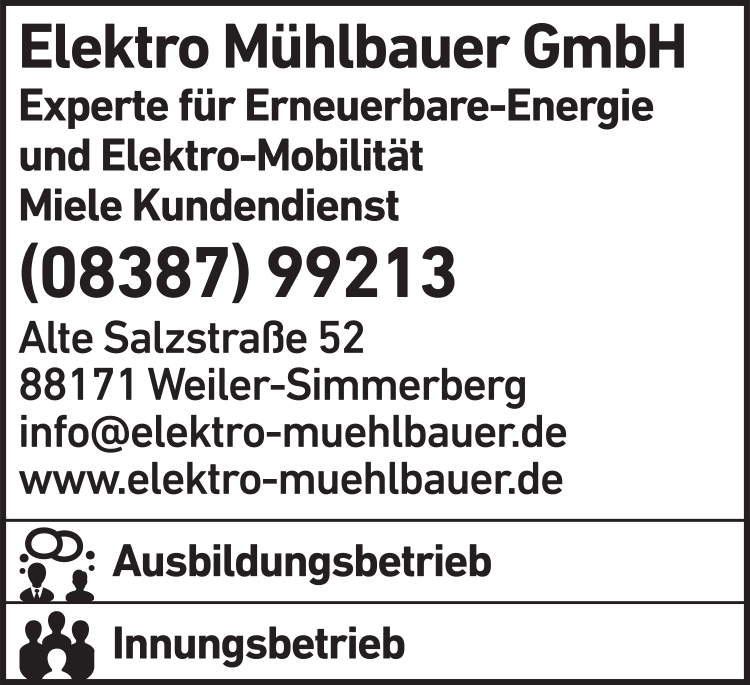 Die Adresse von Elektro Mühlbauer GmbH lautet: Alte Salzstr. 52, 88171 Weiler-Simmerberg