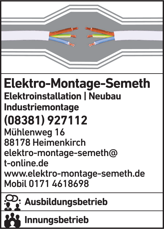 Die Adresse von Elektro-Montage-Semeth lautet: Mühlenweg 16, 88178 Heimenkirch
