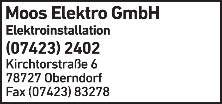 Die Adresse von Elektro Moos GmbH lautet: Kirchtorstr. 6, 78727 Oberndorf