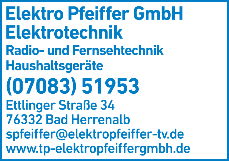 Die Adresse von Elektro Pfeiffer GmbH lautet: Ettlinger Str. 34, 76332 Bad Herrenalb