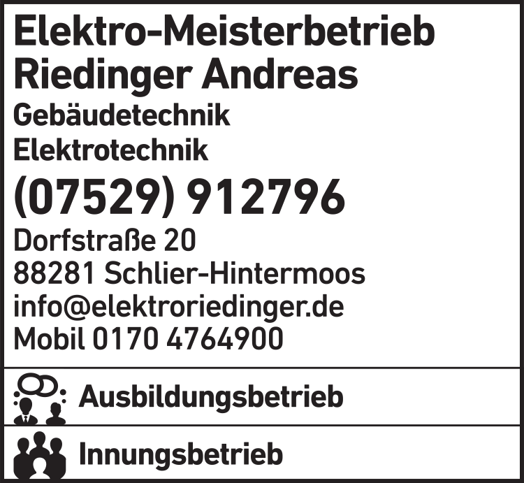 Die Adresse von Elektro Riedinger Andreas lautet: Dorfstr. 20, 88281 Schlier