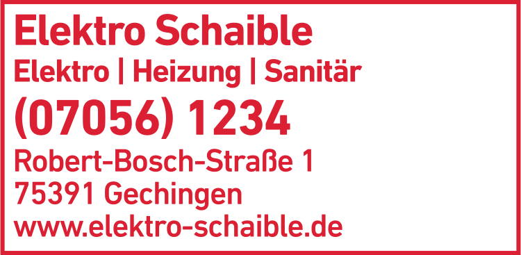 Die Adresse von Elektro Schaible GmbH lautet: Robert-Bosch-Str. 1, 75391 Gechingen