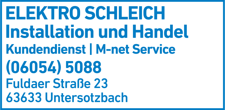 Die Adresse von Elektro Schleich lautet: Fuldaer Str. 23, 63633 Birstein-Untersotzbach