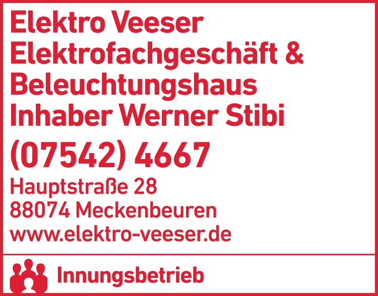 Die Adresse von Elektro Veeser Inh. Werner Stibi Elektrofachgeschäft Beleuchtungshaus lautet: Hauptstr. 28, 88074 Meckenbeuren