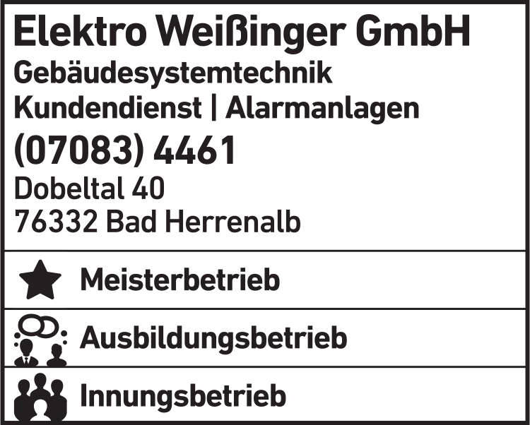 Die Adresse von Elektro Weißinger GmbH lautet: Dobeltal 40, 76332 Bad Herrenalb
