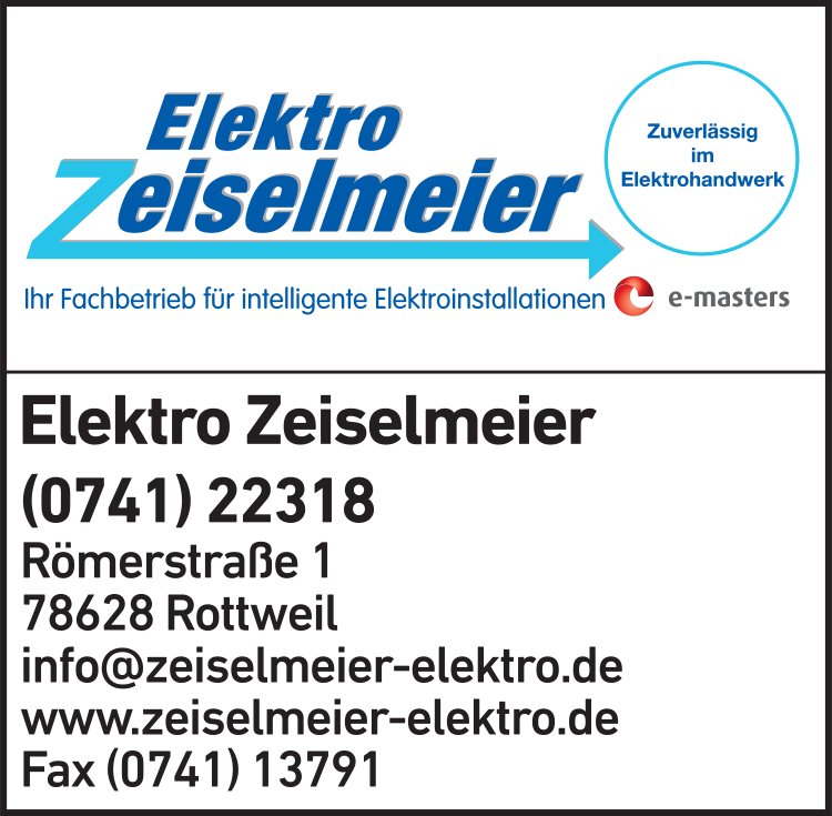 Die Adresse von Elektro Zeiselmeier lautet: Römerstr. 1, 78628 Rottweil