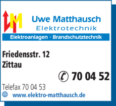 Die Adresse von Elektroanlagen Uwe Matthausch lautet: Friedensstr. 12, 02763 Zittau