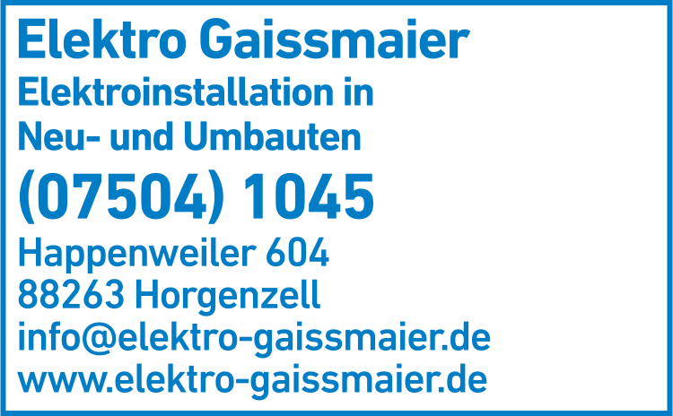 Die Adresse von Elektroinstallation Martin Gaissmaier lautet: Happenweiler 604, 88263 Horgenzell