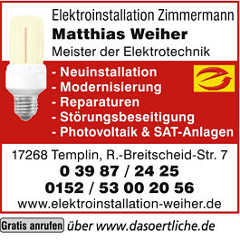 Die Adresse von Elektroinstallation Zimmermann lautet: Rudolf-Breitscheid-Str. 7, 17268 Templin