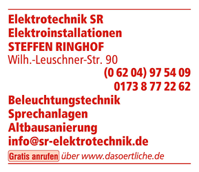 Die Adresse von Elektrotechnik SR Elektroinstallationen STEFFEN RINGHOF lautet: Wilh.-Leuschner-Str. 90, 68519 Viernheim