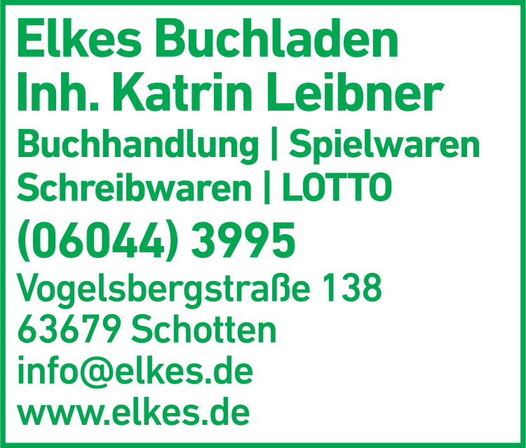 Die Adresse von Elkes Buchladen Inh. Katrin Leibner Geschenke, Schreibwaren lautet: Vogelsbergstr. 138, 63679 Schotten Hess