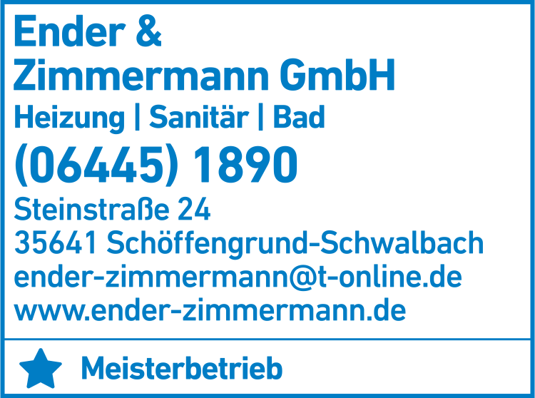Die Adresse von Ender & Zimmermann GmbH Heizung-Sanitär lautet: Steinstr. 24, 35641 Schöffengrund