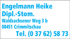 Die Adresse von Engelmann Heike Dipl.-Stom. lautet: Waldsachsener Weg 3 b, 08451 Crimmitschau