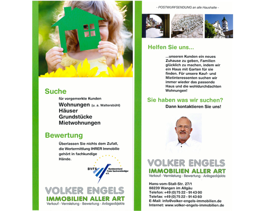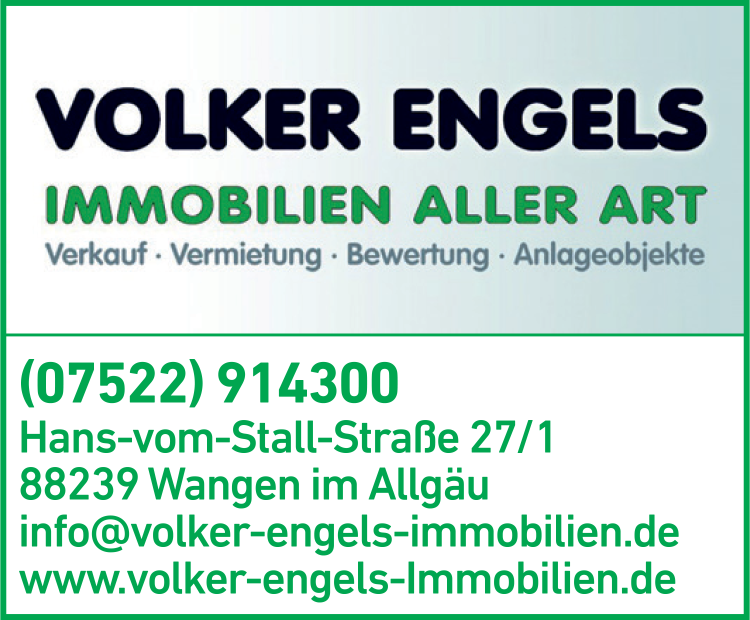 Die Adresse von Engels Immobilien lautet: Hans-vom-Stall-Str. 27/1, 88239 Wangen