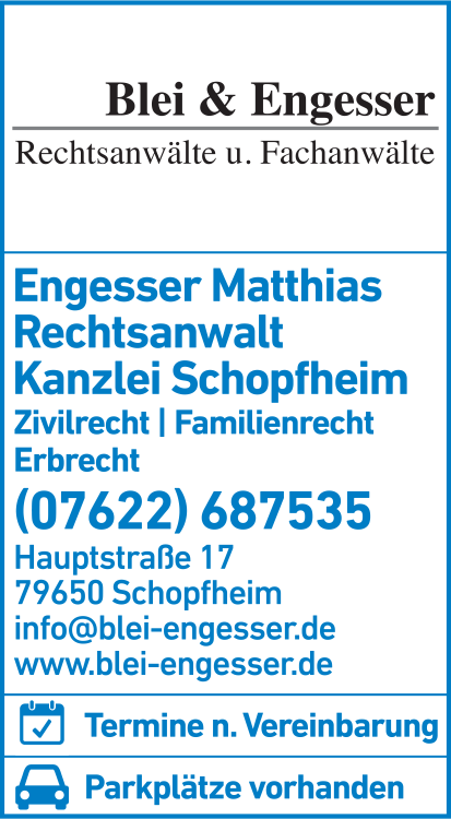 Die Adresse von Engesser Matthias Rechtsanwälte u. Fachanwälte lautet: In der Dorfmatt 20, 79689 Maulburg