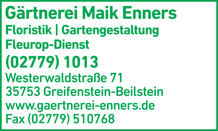Die Adresse von Enners Maik Gärtnerei lautet: Westerwaldstr. 71, 35753 Greifenstein