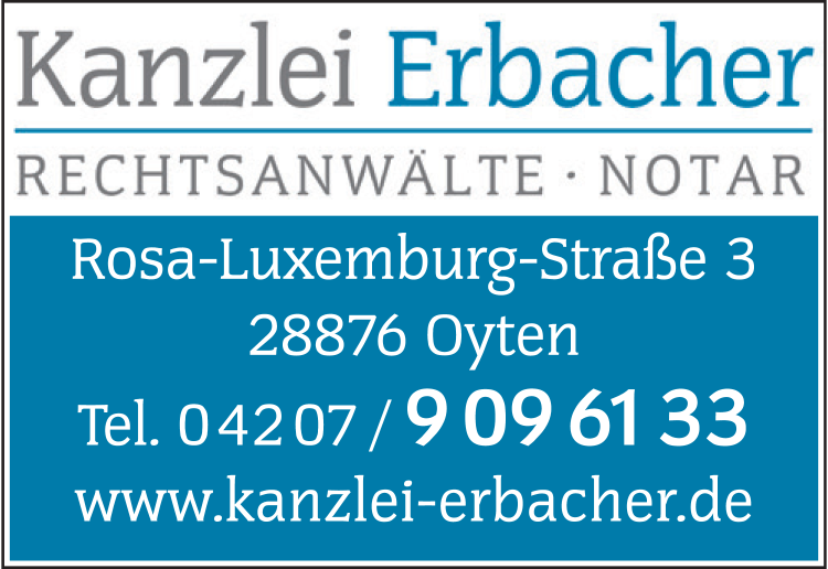 Die Adresse von Erbacher Sache Rechtsanwälte und Notar lautet: Rosa-Luxemburg-Str. 3, 28876 Oyten