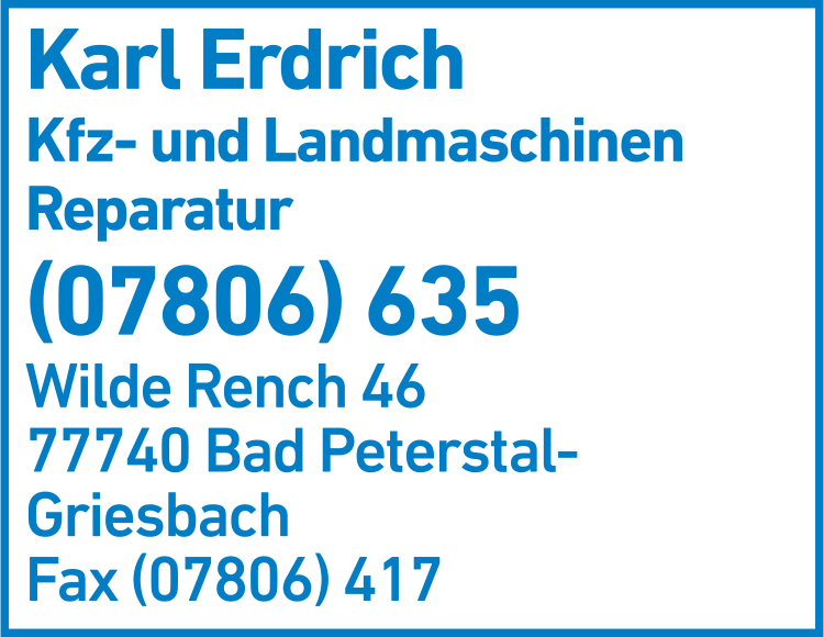 Die Adresse von Erdrich Karl KFZ und Landmaschinen lautet: Wilde Rench 46, 77740 Bad Peterstal-Griesbach