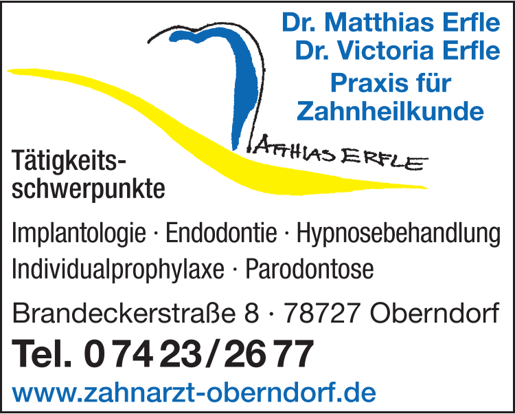 Die Adresse von Erfle Matthias und Erfle Victoria Dres. Zahnarztpraxis lautet: Brandeckerstr. 8, 78727 Oberndorf