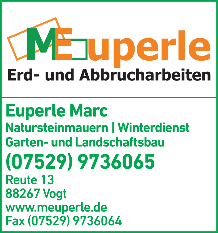 Die Adresse von Euperle Marc Erd- und Abbrucharbeiten lautet: Reute 13, 88267 Vogt