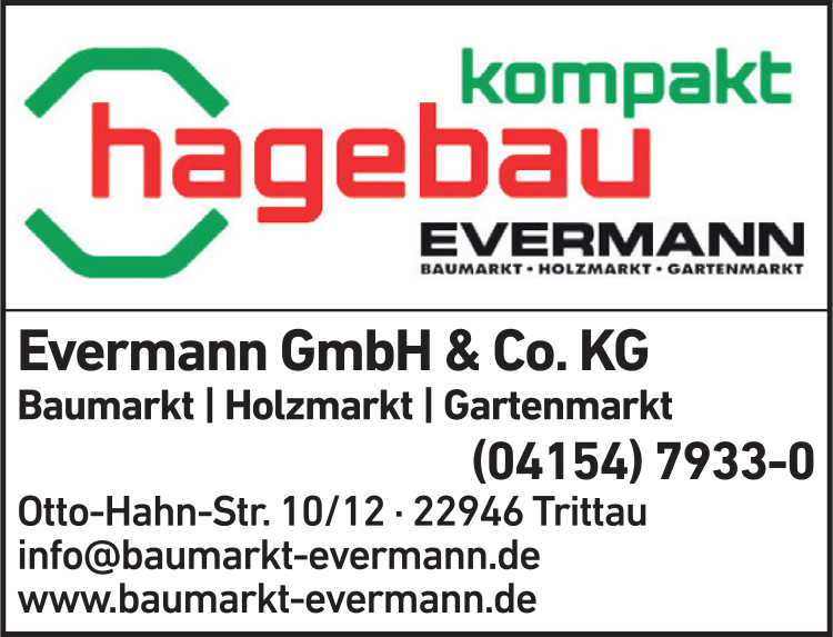 Die Adresse von Evermann GmbH & Co. KG Hagebau lautet: Otto-Hahn-Str. 10-12, 22946 Trittau