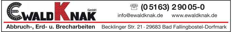 Die Adresse von Ewald Knak GmbH lautet: Becklinger Str. 21, 29683 Bad Fallingbostel-Dorfmark