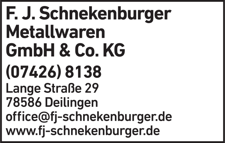 Die Adresse von F. J. Schnekenburger Metallwaren GmbH & Co. KG lautet: Lange Str. 29, 78586 Deilingen