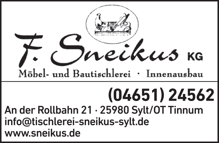 Die Adresse von F. Sneikus KG Tischlerei lautet: An der Rollbahn 21, 25980 Sylt-Tinnum