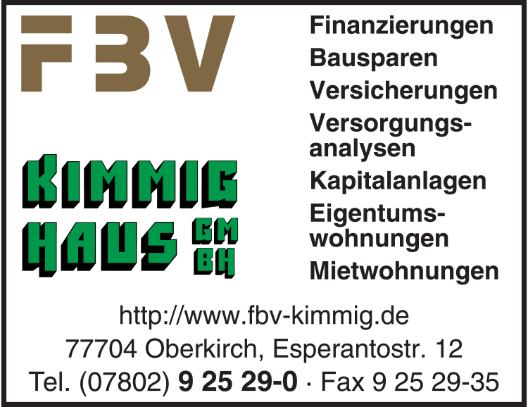 Die Adresse von FBV Finanz-, Beratungs- und Vermittlungs GmbH lautet: Esperantostr. 12, 77704 Oberkirch