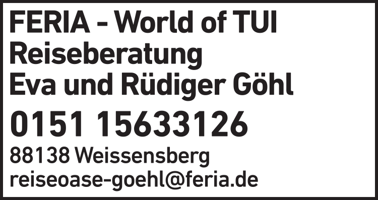 Die Adresse von FERIA- World of TUI Reiseberatung Eva und Rüdiger Göhl lautet: Grübels 22, 88138 Weißensberg