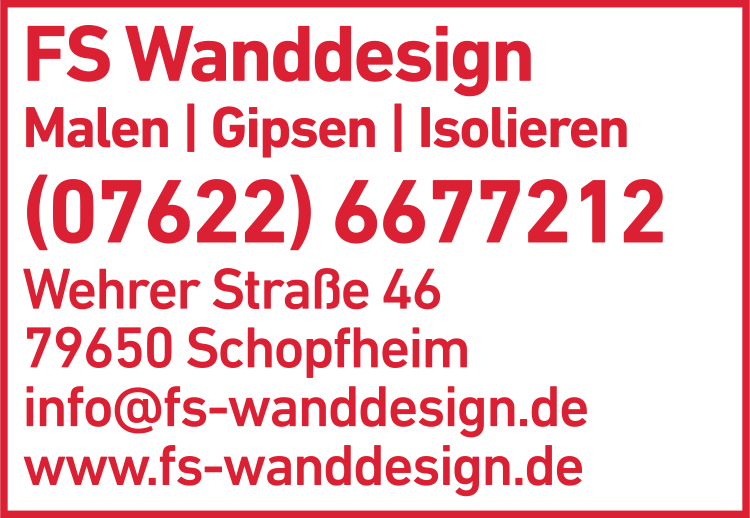 Die Adresse von FS Wanddesign lautet: Wehrer Str. 46, 79650 Schopfheim