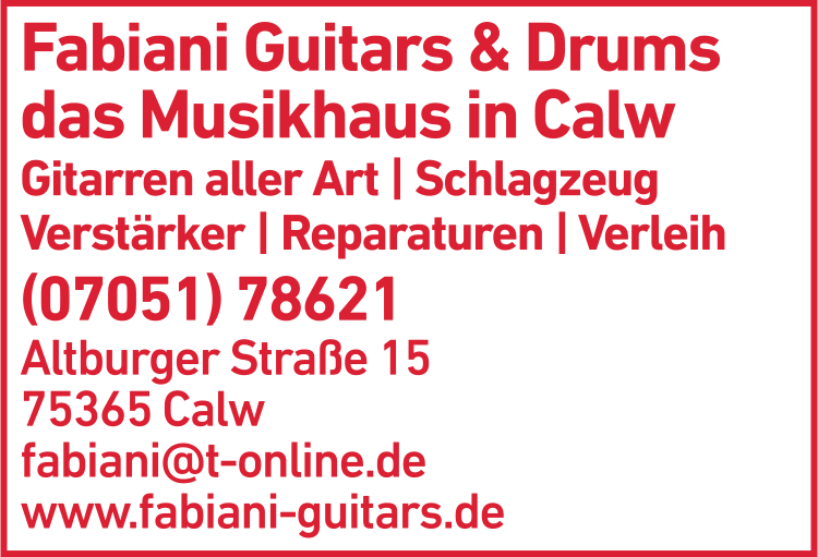 Die Adresse von Fabiani Guitars & Drums Musikhaus lautet: Altburger Str. 15, 75365 Calw