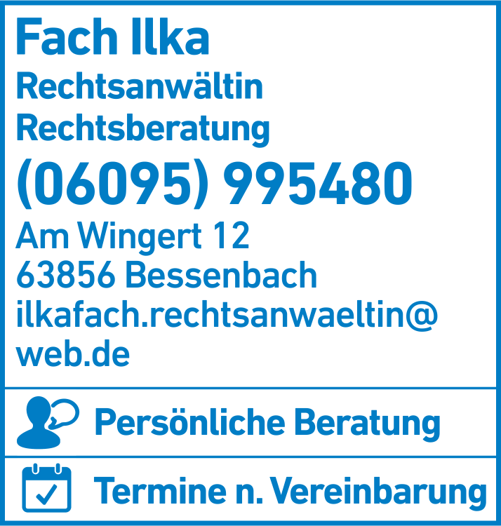 Die Adresse von Fach Ilka Rechtsanwältin lautet: Am Wingert 12, 63856 Bessenbach