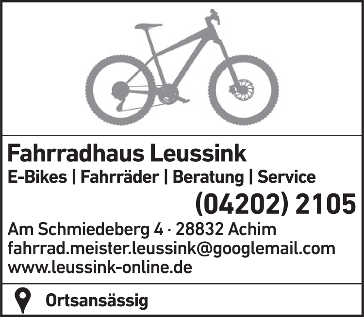 Die Adresse von Fahrradmeister Leussink Fahrradhandel lautet: Am Schmiedeberg 4, 28832 Achim