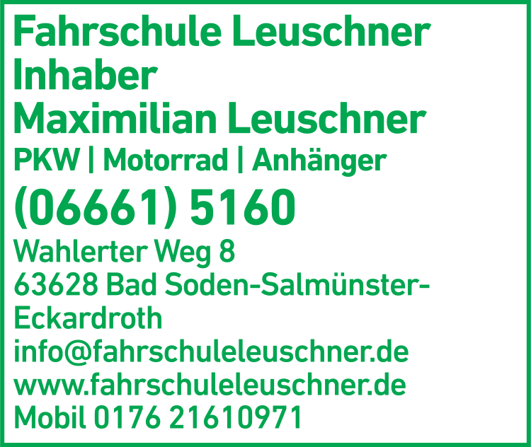 Die Adresse von Fahrschule Leuschner Inh. Maximilian Leuschner lautet: Wahlerter Weg 8, 63628 Bad Soden-Salmünster